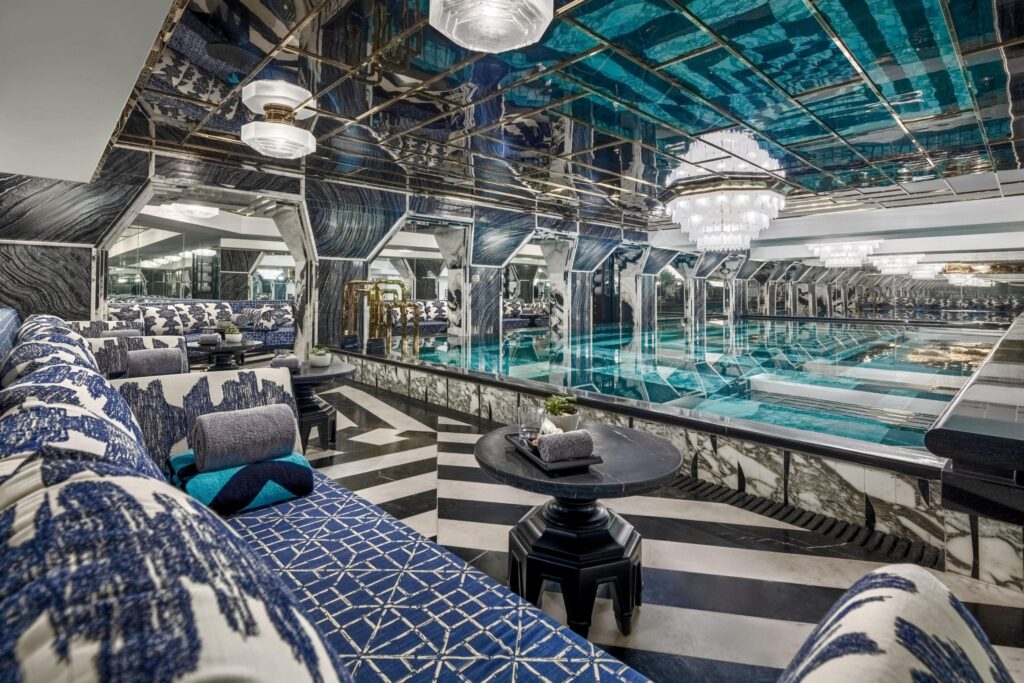 Der Innenpool ist poetisch als “La Grotta” (die Grotte) bekannt. Er ist so gestaltet, dass er wie ein versteckter, ruhiger Zufluchtsort für Opernsänger wirkt, um ihre Stimme auszuruhen und zu regenerieren.
