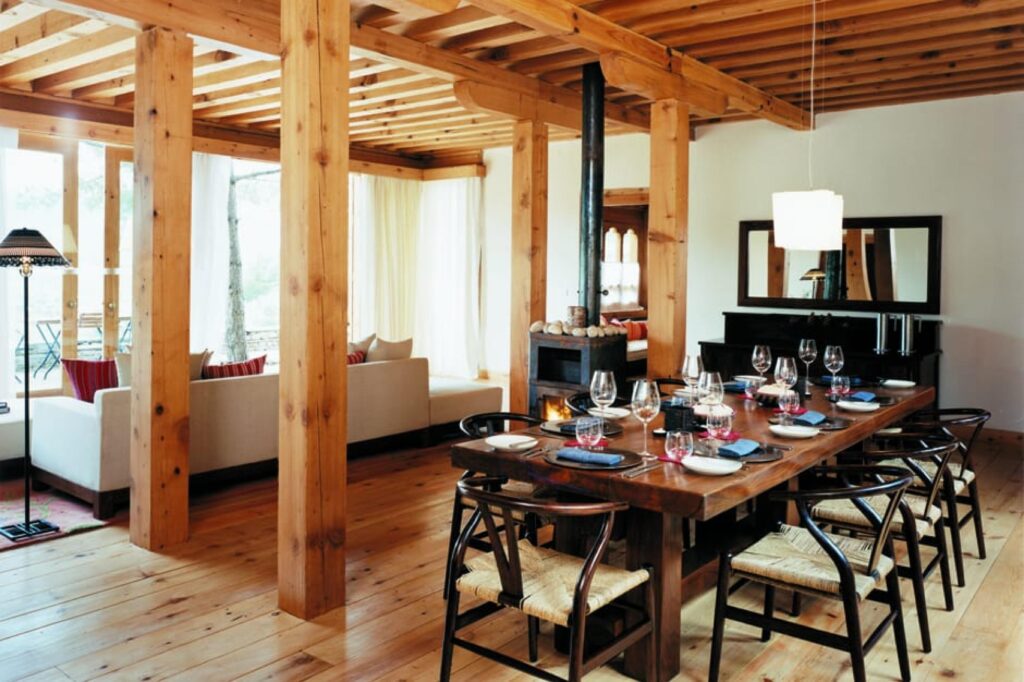 Die Lodge liegt auf einem bewaldeten Bergkamm, der das Paro-Tal überblickt. Die erhöhte Lage bietet spektakuläre Panorama-Ausblicke auf die bewaldeten Hänge, die Reisfelder und die umliegenden Berge Bhutans.