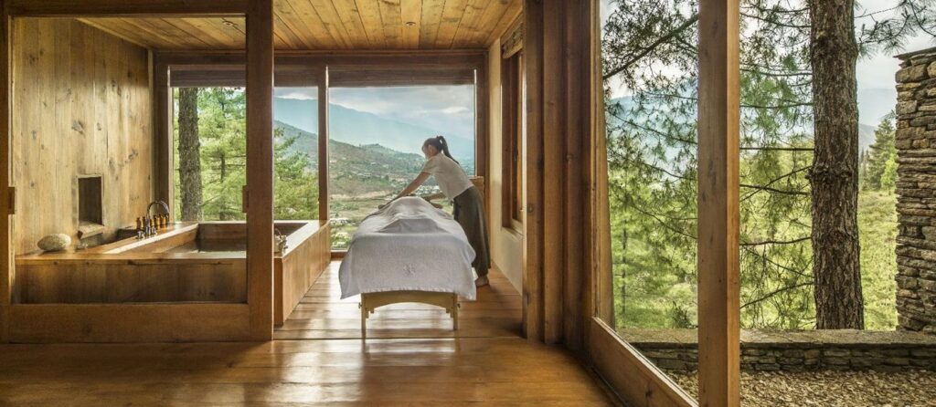 Das Spa bietet zwei private bhutanische Hot Stone Bath-Häuser. Dieses therapeutische Bad, das mit heißen, mineralreichen Steinen angereichert wird, ist ideal zur Entspannung der Muskeln.