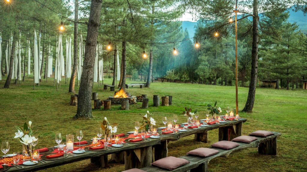 Die Lodge ist auf kulturelle und aktive Erkundungen spezialisiert, einschließlich Bogenschießen (Bhutans Nationalsport), geführten Wanderungen, Mountainbiking und privaten Picknicks in der Natur.