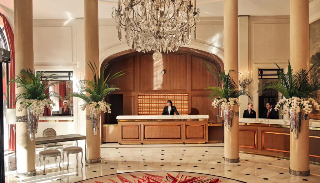 Die rote Markise des Plaza Athénée ist weltberühmt, doch wahre Kenner lieben die versteckte Cour Jardin, wo im Sommer unter Lichterketten Champagner serviert wird.