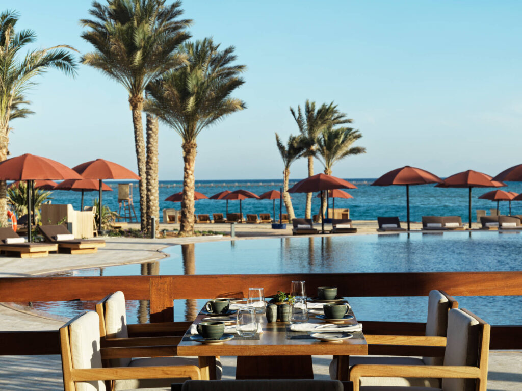 Restaurants und Lounges verbinden Produkte mit mediterraner Leichtigkeit und Akzenten. Patisserie begleitet den Tag, abends tragen Weine und Cocktails Gespräche. Terrassen liegen am Wasser, Abende färben die Tische am Roten Meer gold,