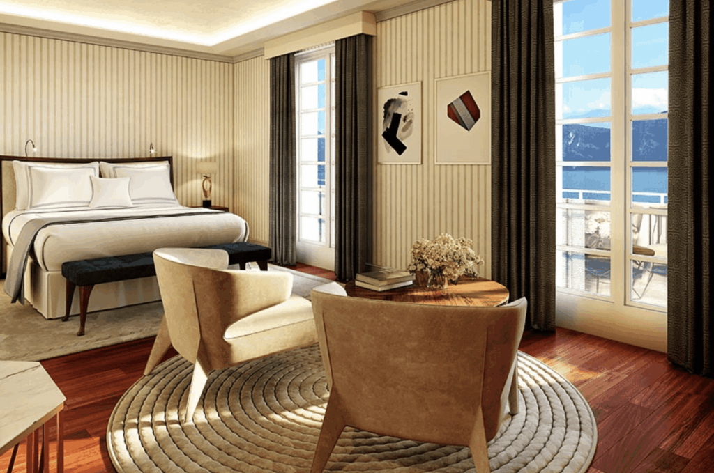 Holzböden, Pastellmöbel und Tapeten wurden speziell nach der Chenot-Philosophie entworfen, um glückselige Momente der Entspannung und Regeneration zu bieten. – Flachbildfernseher – Kostenloses WLAN – Badezimmerboden aus Marmor – Kissenmenü – Täglich kostenloses Wasser – Kostenlose Kosmetikprodukte von Chenot – Butler-Service auf Anfrage