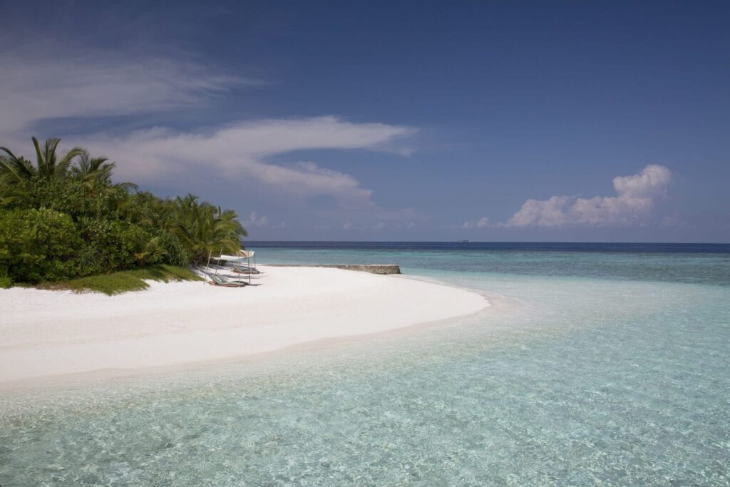 Schlanke Kokospalmen säumen den schneeweißen, feinsandigen Strand, und die dichte tropische Vegetation verschleiert die einhundert Designer-Villen des Coco Bodu Hithi, die allesamt über einen Privatpool verfügen.