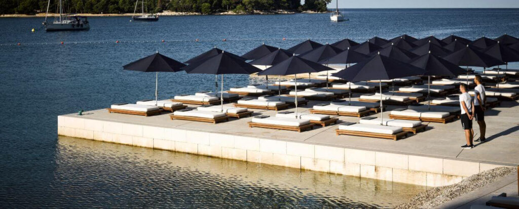 Das Hotel liegt nahe am Meer und ist nur 15 Gehminuten von Rovinj entfernt. Es ist von üppiger mediterraner Vegetation umgeben und fügt sich diskret in das natürliche Ambiente des jahrhundertealten, geschützten Waldparks Zlatni rt ein, der auch als Punta Corrente bekannt ist.