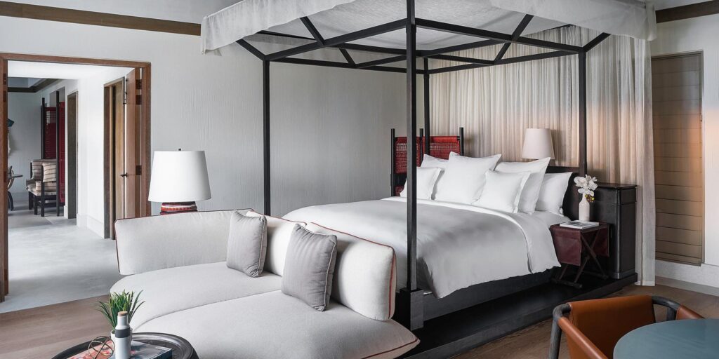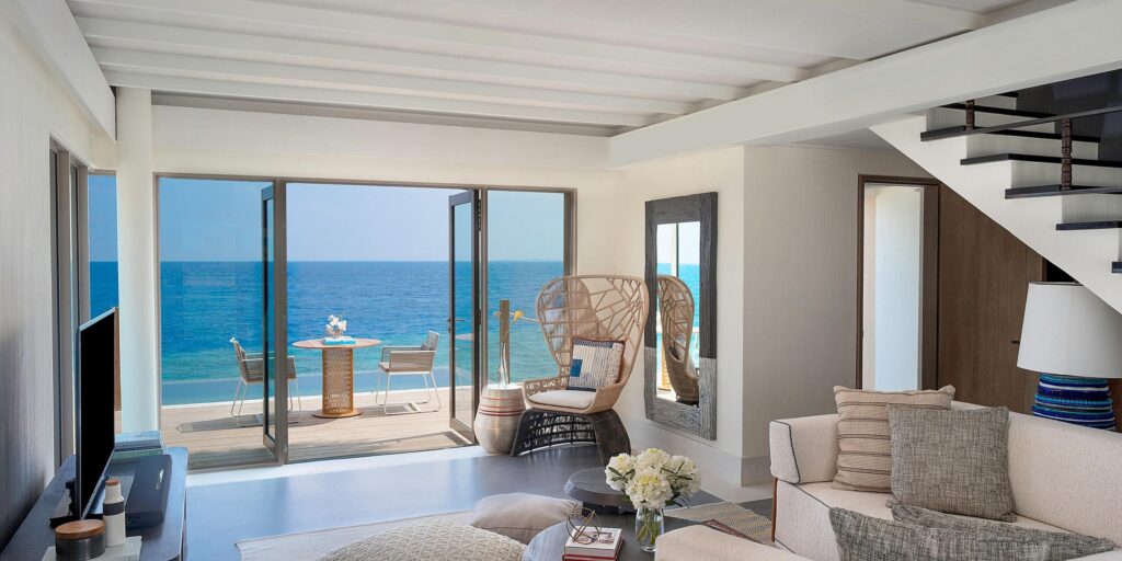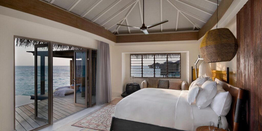 Auf der ganzen Insel verteilen sich 81 geräumige Strand-, Lagunen- und Überwasser-Villen und -Residenzen, von denen jede über eine eigene Terrasse und einen eigenen Pool verfügt und einige der atemberaubendsten Ausblicke auf die Malediven bietet – von denen der größte eine königliche Strandresidenz mit drei Schlafzimmern ist .
