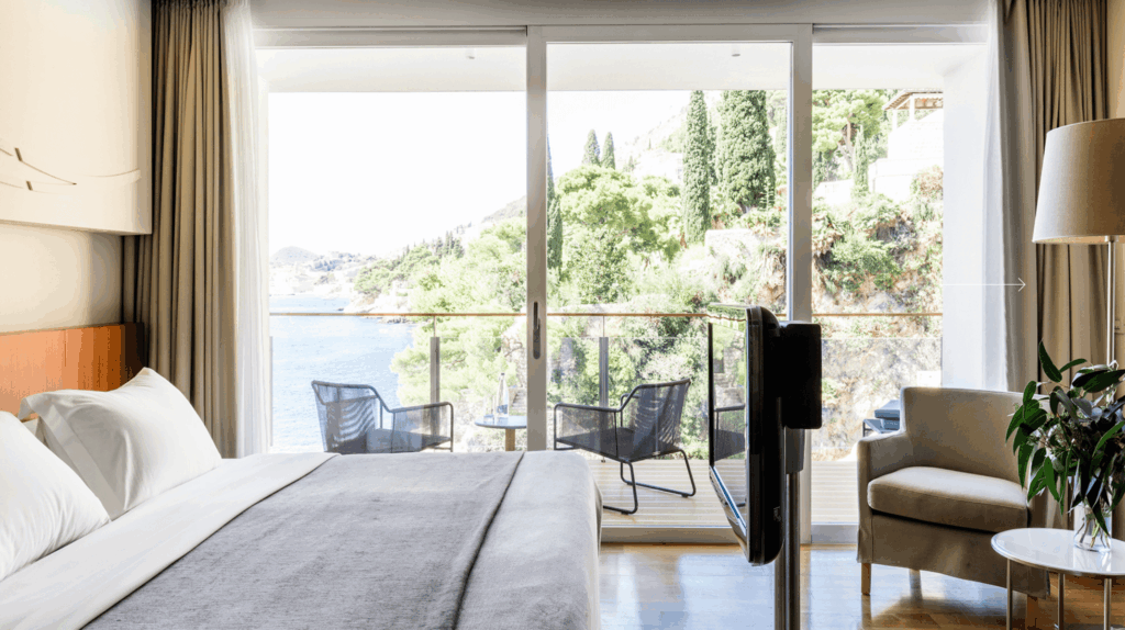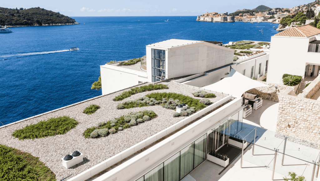Die makellose weiße Architektur des Hotels bietet einen atemberaubenden Kontrast zur felsigen Landschaft und dem smaragdgrünen Wasser der Adria. Die klaren, nautischen Linien der Unterkunft rufen eine zurückhaltende Raffinesse hervor. Die 55 Zimmer der Villa Dubrovnik strahlen einen eleganten, zeitgemäßen Stil aus, der durch Holzdetails, eine neutrale Farbpalette und moderne Möbel hervorgehoben wird. Die Innenräume sind in Tageslicht getaucht und bieten Parkett in warmen Farbtönen und Terrassen aus wunderschönem Teakholz mit stromlinienförmigen Stühlen und Liegestühlen im Freien.