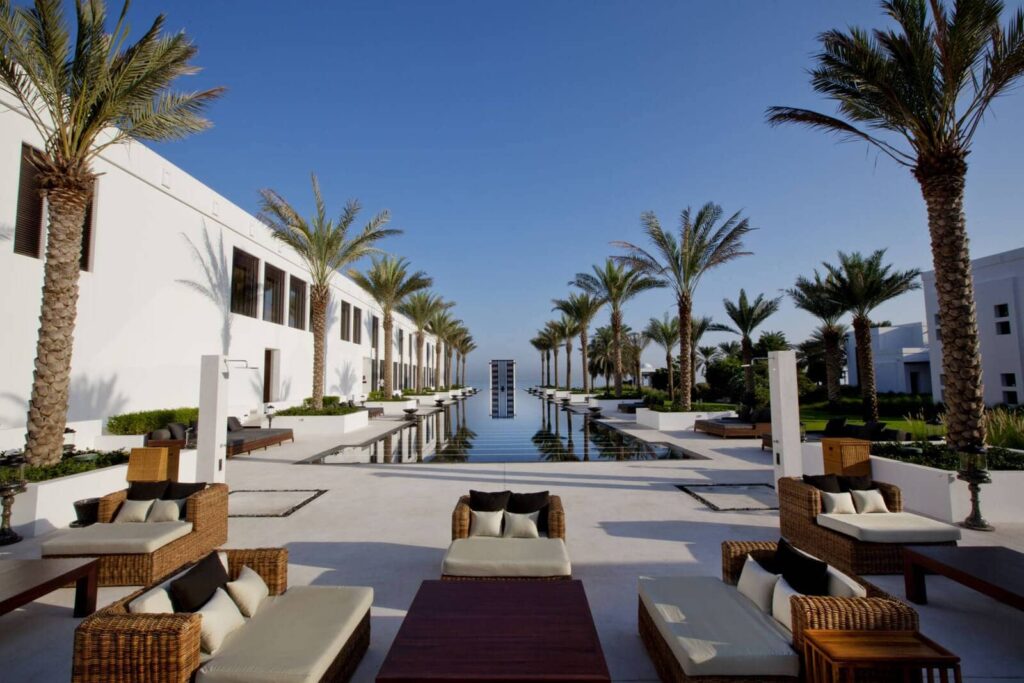 Muscat – Das Luxusrefugium verbindet gekonnt modernes Design mit arabischen Stilelementen. An den mit gekühltem Wasser gespeisten Pools befinden sich herrlich große Tagesbetten, die im Schatten zum Lesen, Ausruhen und Träumen einladen.